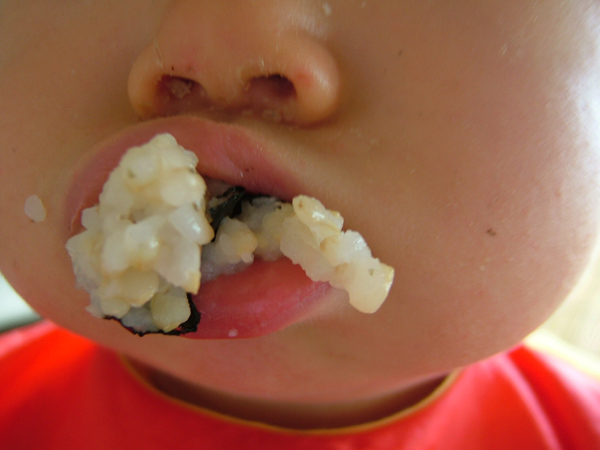 おにぎりを半分食べた所でチッチが「そっちのパンがほしい」と言い出し、少しちぎってあげ、チッチ大好物・男前豆腐を2/3ほど食べた所で「んーっ ぱっ!(←「ごちそうさま」と言ってる)」
