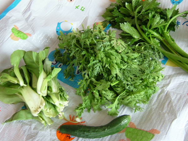 チンゲンサイ(左)に、春菊(中)に、セロリ(右)に、キュウリ(下)に・・・。