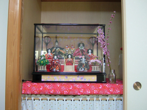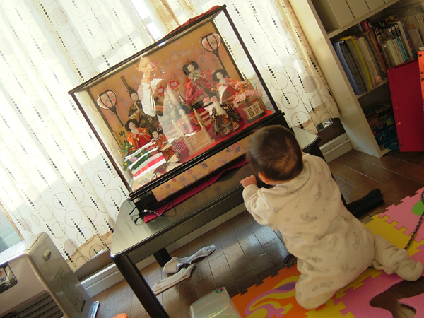 帰ってきた空君に、「見てみて、チッチとお雛さま」