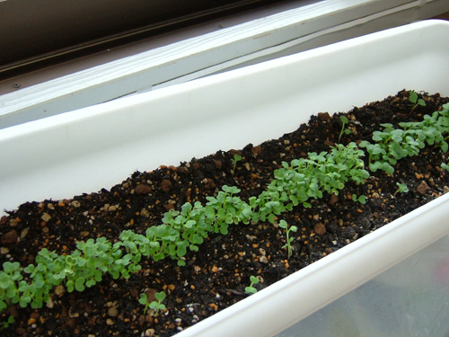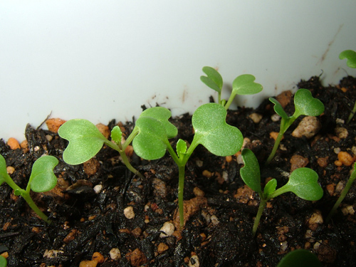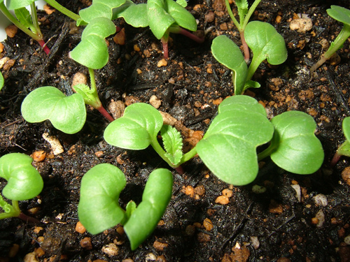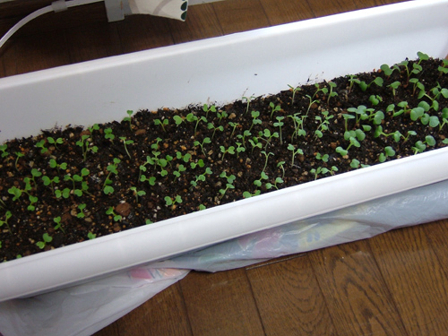 ラディッシュは「ハツカ(二十日)ダイコン」とも言い、種まきから20日(べんり菜は約30日)ほどで収穫できるそうですが、やはり寒いせいか、うちの子たちは20日ほどたった今でもまだまだカワイイ葉っぱ・ひょろんとした根っこ、「野菜」には程遠い姿でプランターの中に身を寄せ合っております。