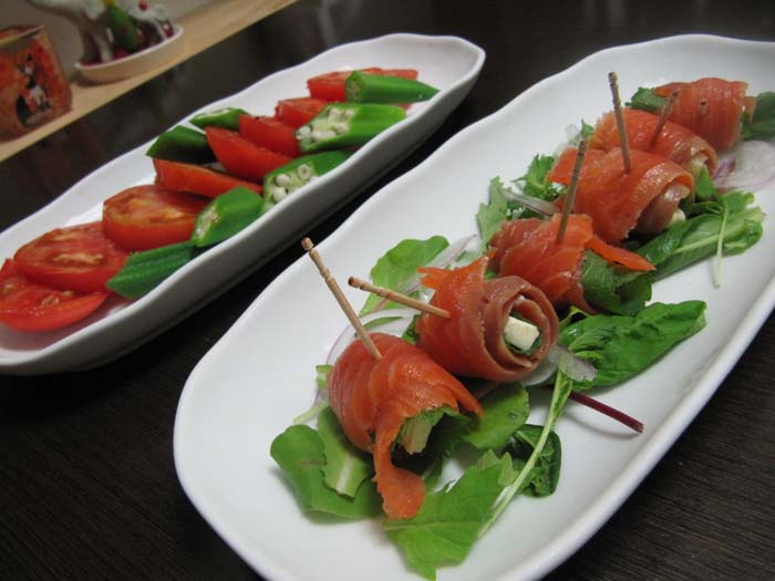 自家製トマト・オクラの切っただけ・ゆでただけ↓